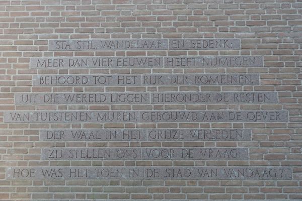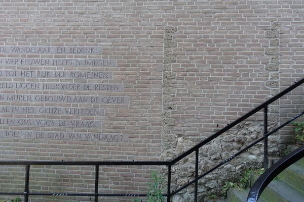 ‘Hoe was het toen in de stad van vandaag’, lees je op de van Steenstraat 26-28 naast het Besiendershuis. De tekst van professor Jules Bogaers, Nijmeegs hoogleraar provinciaal-Romeinse Archeologie verwijst naar het Romeins verleden van Nijmegen. Rechts naast dit citaat zie je de doorsnede van een laat-Romeinse muur. In de tweede eeuw moest die muur de handelsnederzetting aan de Waalkade beschermen. Een ander deel van de muur is in de jaren tachtig gevonden op de plek waar nu het Holland Casino staat.