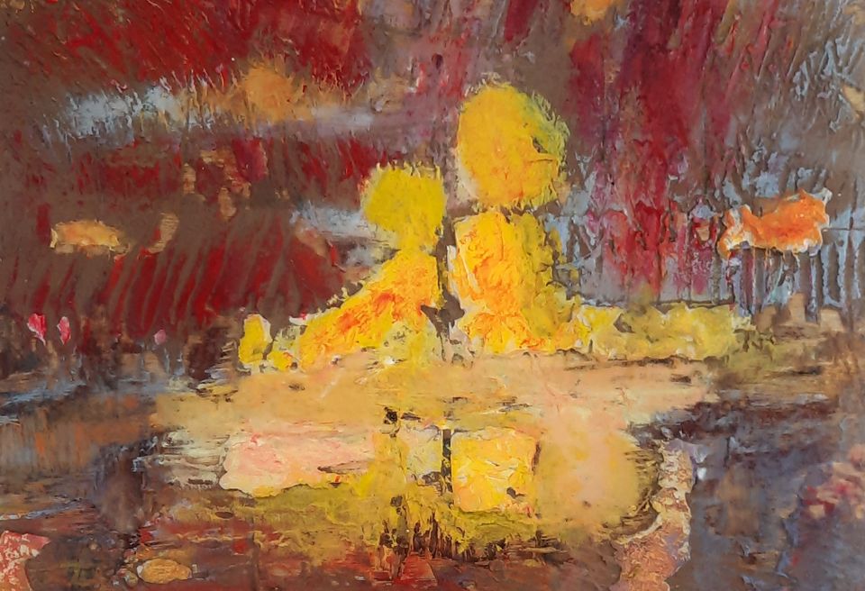 Het werk van Marijke Teunissen omvat ‘gewone’ schilderijen en een specifieke variant, schilderijen op houten panelen, afgewerkt met transparante epoxy. Voor beide soorten werk geldt steeds de vraag van de kunstenaar: kies ik voor een menselijke figuur, die actief is in een omgeving of beperk ik me tot een omgeving die een bepaalde uitstraling heeft?