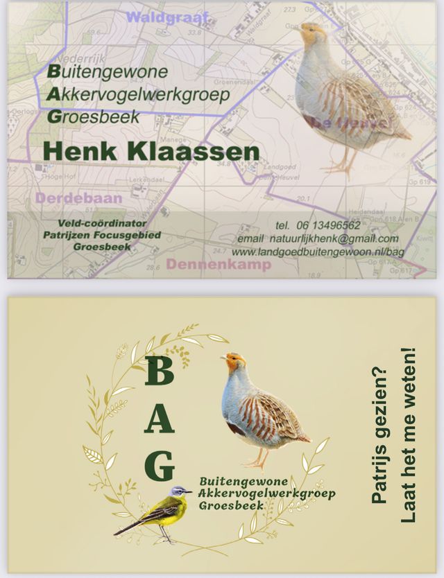 De patrijs, ooit een vertrouwde verschijning in ons boerenland, is de afgelopen decennia bijna verdwenen. In Groesbeek ligt één van de zeven zogeheten Patrijzenfocusgebieden in het Rivierenland – plekken waar kansen zijn om deze zwaar bedreigde akkervogel in ons landschap te behouden. De Buitengewone Akkervogelwerkgroep Groesbeek (BAG) – is in navolging van de patrijzenprojecten in Aalten en Montferland - gestart met het project “Samen voor de Groesbeekse Patrijs”. Met steun van onder andere Vogelbescherming, Collectief Rivierenland, Stichting Landschapsbeer Gelderland, de Gemeente Berg en Dal en de Vereniging Nederlands Cultuurlandschap werken we samen aan het inrichten van het Patrijzenfocusgebied Groesbeek waarmee we de biodiversiteit voor de patrijs, vlinders, bijen en andere akkervogels verbeteren en hun overlevingskansen vergroten.