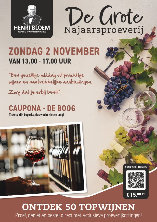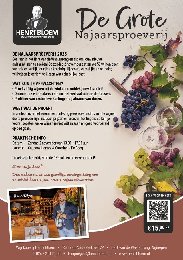 Één jaar in het Hart van de Waalsprong en tijd om jouw nieuwe najaarswijnen te zoeken! Op zondag 2 november zetten ze 50 wijnen open bij Henri Bloem: van fris en vrolijk tot rijk en krachtig. Jij proeft, vergelijkt en ontdekt; Bij Henri Bloem helpen ze je gericht kiezen wat echt bij jou past.