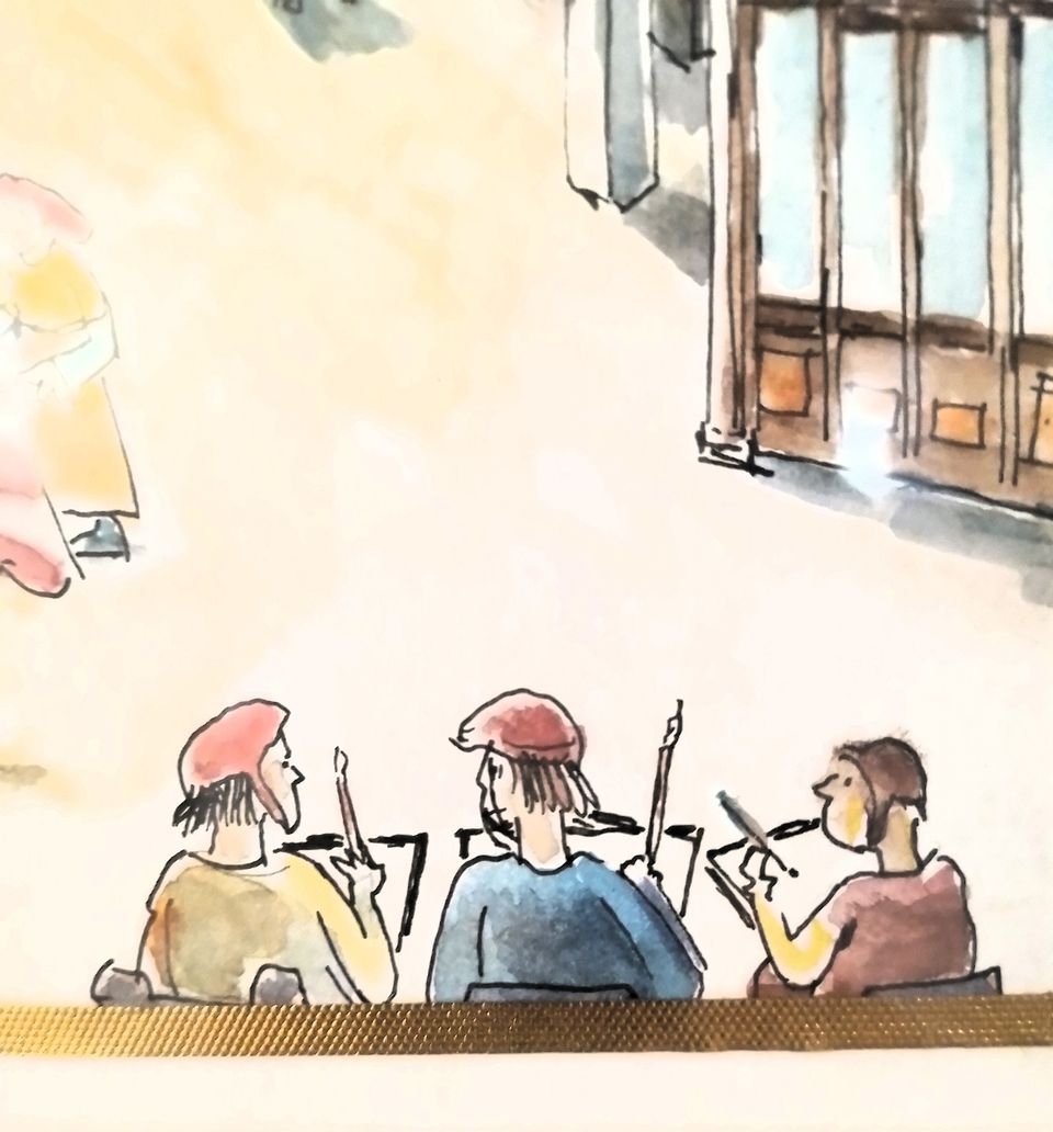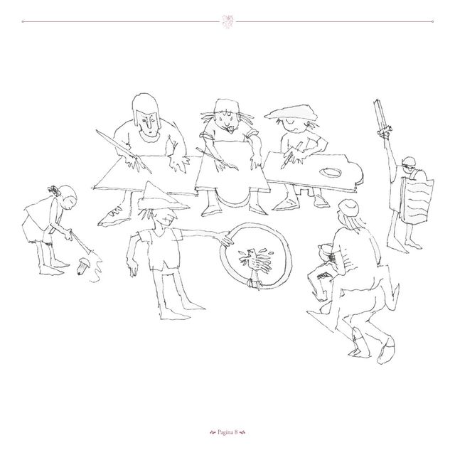 Het is een fraai opgemaakt boekwerk in prenten in aquarel afgewisseld met platen om in te kleuren.
