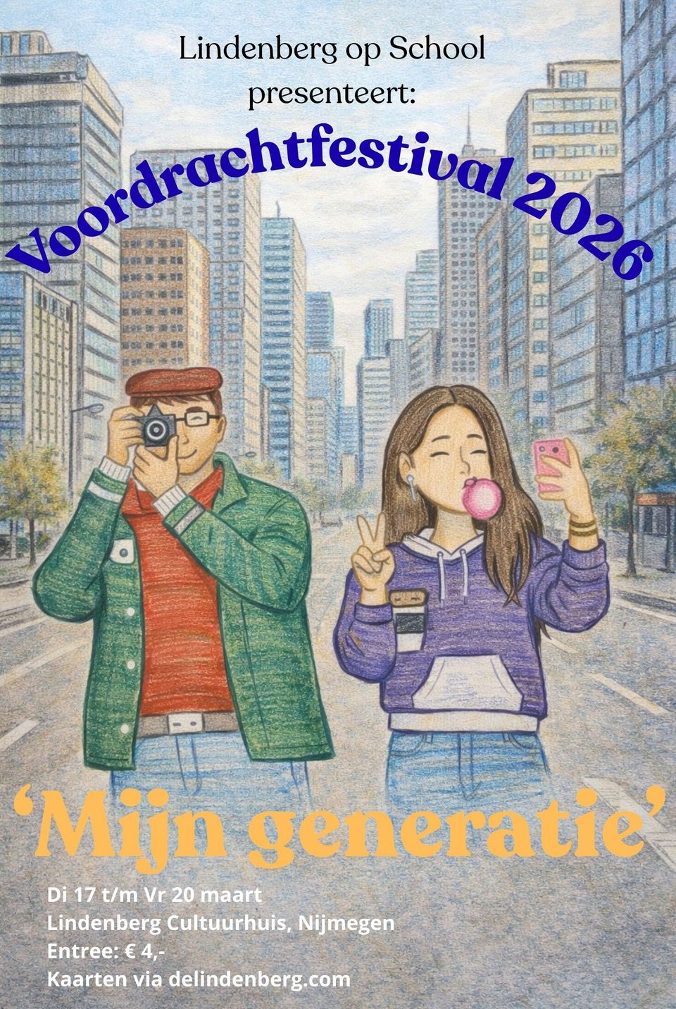 De leerlingen spelen een zelfgemaakte voorstelling rondom het Boekenweekthema Mijn generatie. Met dans, theater, muziek, beeldende kunst en digitale vormgeving geven zij hun interpretatie van literaire teksten en gedichten. Deze voorstellingen worden eenmalig voor publiek gespeeld tijdens de voorstellingsweek in de Lindenberg. Kom jij ook kijken?
