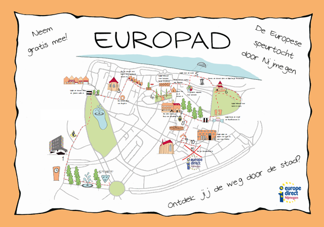 Het EUROPAD is een leuke speurtocht voor kinderen van 9 tot 12 jaar door het centrum van Nijmegen. De route komt langs plekken in Nijmegen die iets met Europa te maken hebben. Met behulp van een grote schatkaart ontdekken kinderen de route, onderweg worden leuke puzzels opgelost. Alle antwoorden gevonden? Haal dan gratis een leuk prijsje op bij de Stadswinkel!
